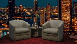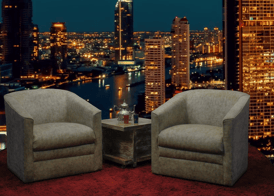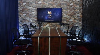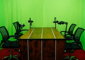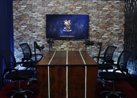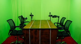 Estúdio completo para gravação de podcasts ao vivo.